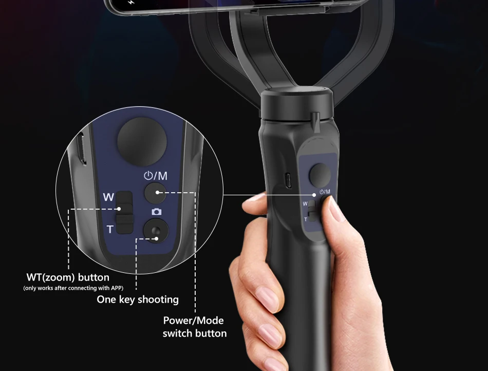 O gimbal foi atualizado. Nova versão pode usar com APP. O botão WT só pode ser usado após a conexão com o aplicativo. Para o uso do botão do modo, encontre por favor as pontas do uso nos seguintes detalhes.